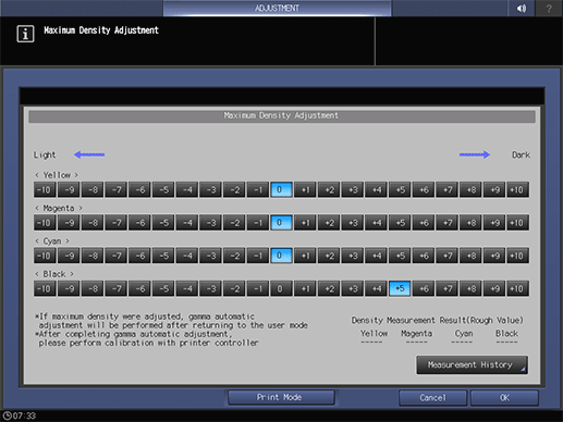 After outputting the charts, the screen returns to the Maximum Density Adjustment screen and the measurement result is displayed under "Density Measurement Result (Rough Value)" in the lower right of the screen.