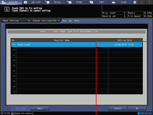 supplementary explanationTo use the color sensor adjustment data for each paper type for correction, press Registered Adj. Data to display the Each Paper Type Color Adjustment List screen and select the color sensor adjustment data for the desired paper type, and then press OK.