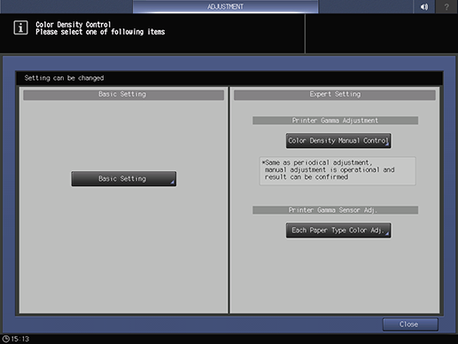 supplementary explanationYou can also display the Color Density Manual Control screen by pressing Color Dens. Manual on the MACHINE screen.
