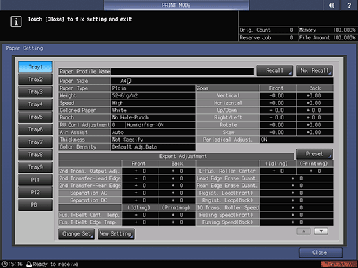 supplementary explanationPress Close on the Paper Setting screen to return to the PRINT MODE screen.