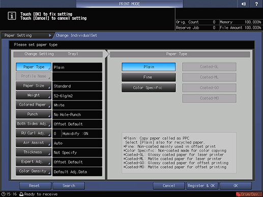 supplementary explanationPress OK on the Change IndividualSet screen to return to the Paper Setting screen.