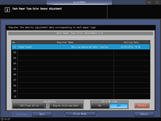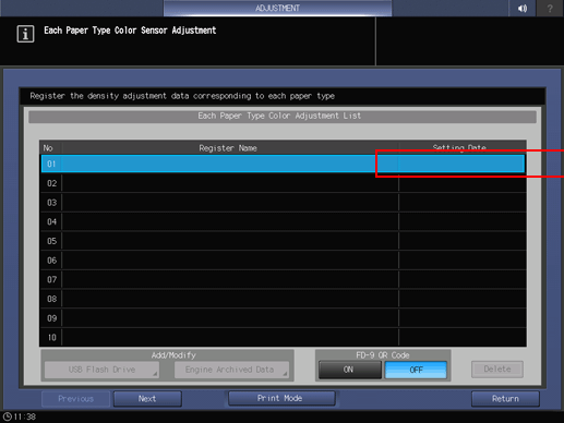 If the color sensor adjustment data for each paper type has already been registered, the register name and date are displayed. If a registered item is selected, the existing data is overwritten.