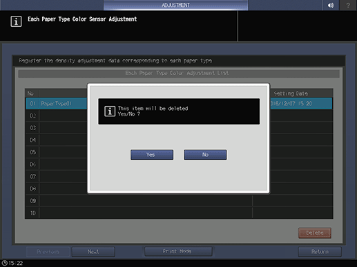 Once you have deleted the color sensor adjustment data for each paper type, you cannot recover it. Please be careful in deletion.