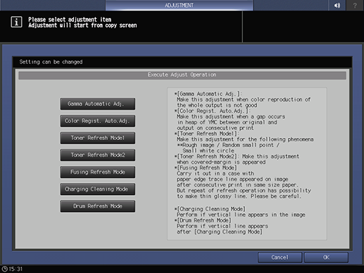 These seven adjustment operations are the same as those of Administrator Setting - System Setting - Expert Adjustment - Execute Adjust Operation of the UTILITY screen.
