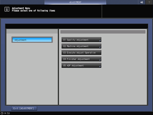 Press Adjustment on the MACHINE screen to display the Adjustment Menu screen.