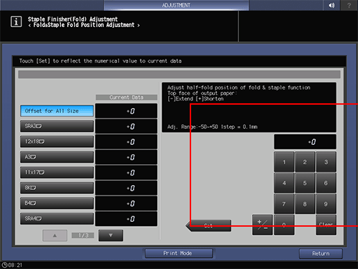 The screen returns to the Staple Finisher(Fold) Adjustment Menu screen.