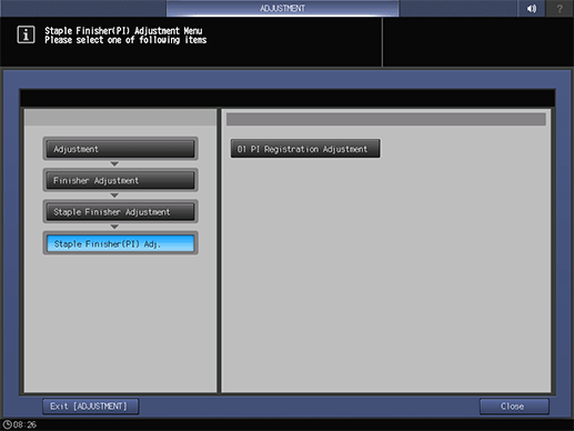 2. Press Finisher Adjustment, Staple Finisher Adjustment, Staple Finisher(PI) Adj., and PI Registration Adjustment in sequence.