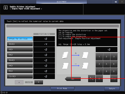 The screen returns to the Saddle Stitcher Adjustment Menu screen.