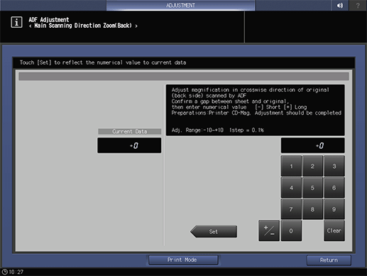 2. Press ADF Adjustment and Main Scan Dir. Zoom(Back) in sequence.
