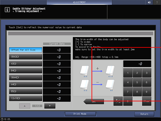 Adjust the trimming width determined by Saddle Stitcher SD-506. The trimming width should be more than 2.0 mm, otherwise the trimming operation may not performed properly.