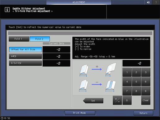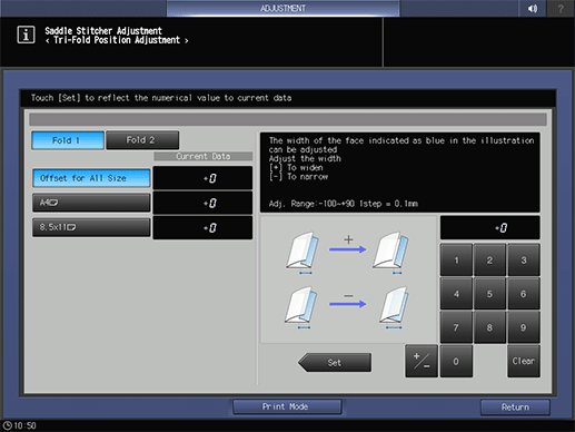 supplementary explanationAdjustment Range (Fold 1): -100 (To widen) to +90 (+30 for 8.5 11 short edge feed) (To narrow) (1 step = 0.1 mm)
