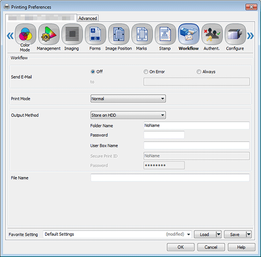 Click the Workflow tab, and then select Store on HDD in Output Method.