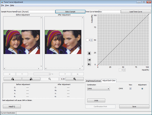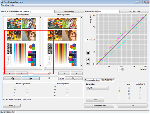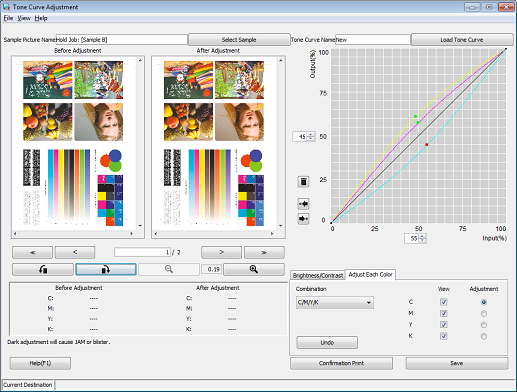 Under Adjustment, select the radio buttons of the colors that you want to adjust (C/M/Y/K). Click on the tone curve and drag the displayed handle (operating point) to adjust the tone curve.