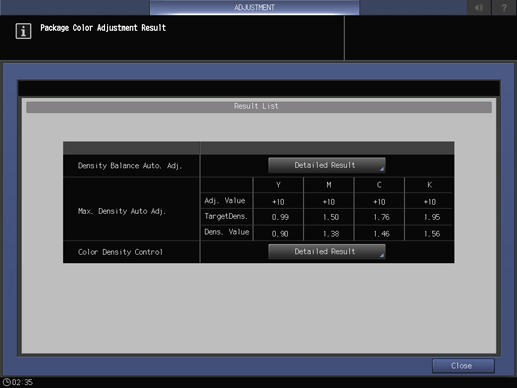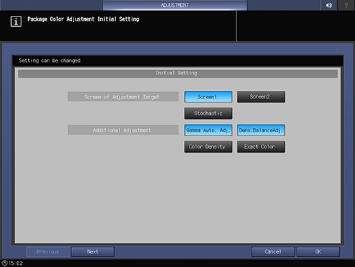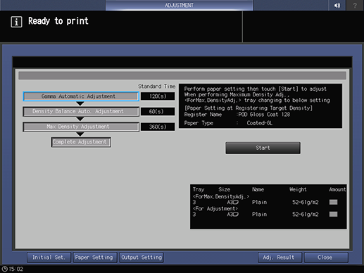 4. Change any setting (Screen of Adjustment Target, Additional Adjustment, Maximum Density Adjustment Tray, or Adjustment Tray).