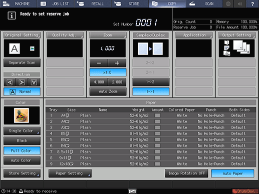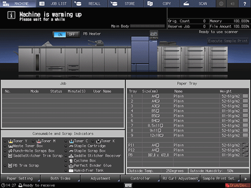 • supplementary explanationPressing the COPY tab on the screen during warm-up displays the COPY screen. When the message Ready to set reserve job appears on the COPY screen, you can set reserve jobs and scan originals while the machine is warming up so that the machine starts printing immediately after warm-up is completed. For details, refer to Reserving Copy Jobs during Warm-up.