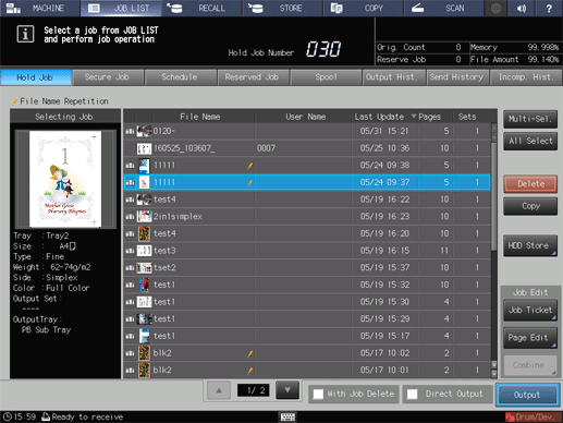 1. Select a job from the hold job list in the JOB LIST screen, and then press Job Ticket.