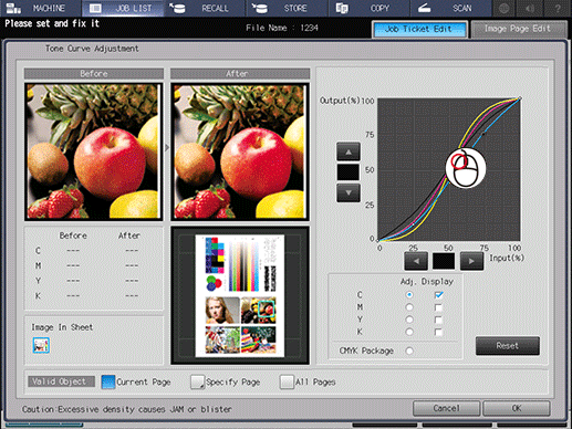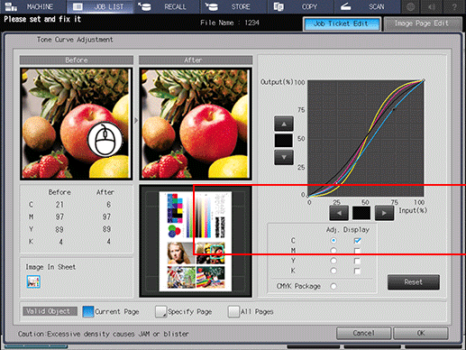 If the cursor is placed anywhere on the Before or After image, the CMYK values before and after adjustment are displayed.