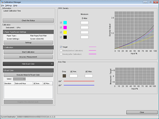 Measure D-Max | Displays measured D-Max when calibration is executed or calibration accuracy is measured. D-Max is the maximum density. It is the state in which the density is not enough. If the measured value too much higher than D-Max, the gradation may become rough. It is the state in which the output from 0% - 100% is performed with a smaller number of steps (example: 0% to 80%). |