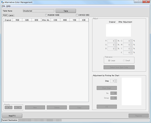 Multiple alternative color tables are stored in the image controller. They replace specific colors of RGB and CMYK in jobs with CMYK colors (alternative colors).