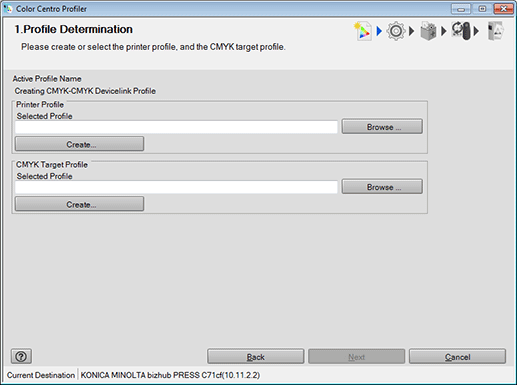 On the Profile Determination screen, specify the printer profile and the CMYK target profile which are used by CMYK-CMYK device link profile. In addition, you can create the printer profile and the CMYK target profile as required.