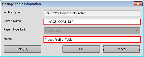 supplementary explanationBut, you cannot change the table name of the RGB-CMYK device link profile which was registered at factory shipping.