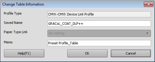 • supplementary explanationBut, you cannot change the table name of the CMYK-CMYK device link profile which was registered at factory shipping.