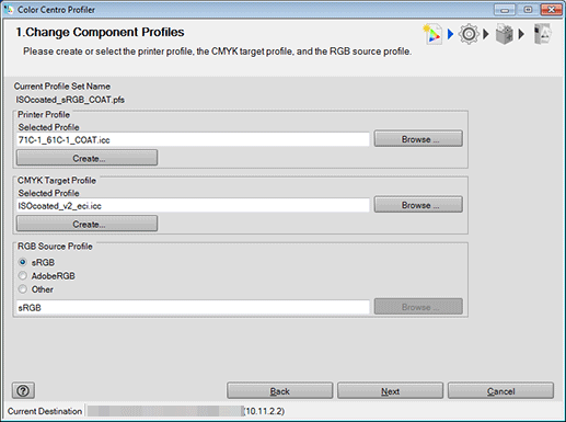 On the Profile Determination screen, as required, change the printer profile, the CMYK target profile and the RGB source profile which are used by Profile Set. In addition, you can create the printer profile and the CMYK target profile as required.