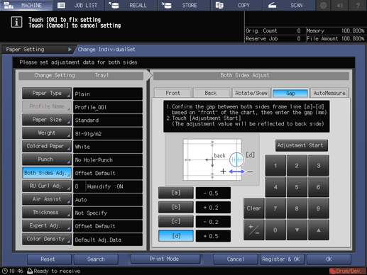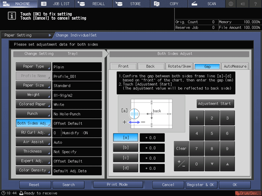 Gapadjustment is the simple method to adjust the magnification and image position of the back side only. To adjust both sides, perform the procedure shown in [Front] Adjustment.