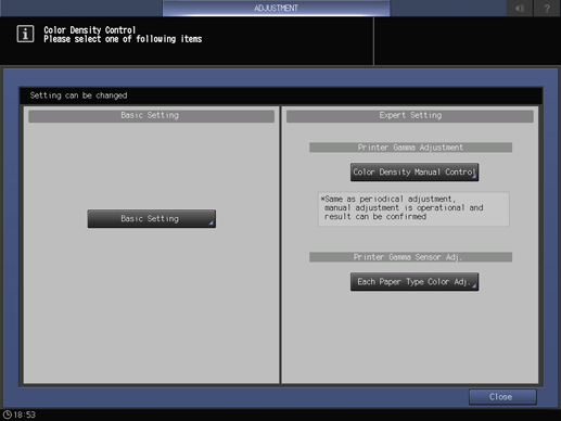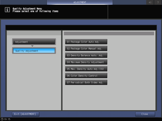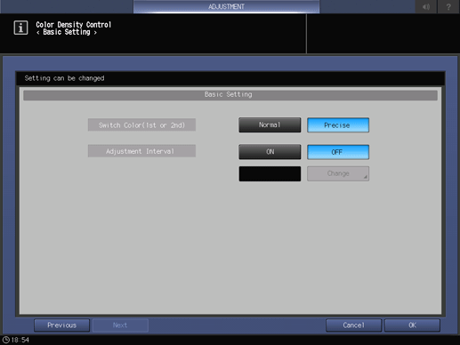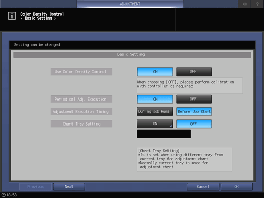 supplementary explanationTo automatically perform the density control with the RU option (Relay Unit RU-511), set the Periodical Adj. Execution to ON.