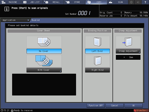 • supplementary explanationThe paper tray for the body sets is automatically selected as default. If you also select With Cover in step 6, the two tray keys are selected. To change the tray for cover, refer to step 7.