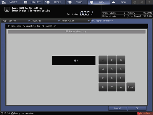 • supplementary explanationWhen PI1 or PI2 is selected, Quantity is available. Display the PI Paper Quantity screen, then use the keypad on the screen or press the down or up key to enter the number of cover sheets. You can enter 1 to 40 sheets. Press OK.