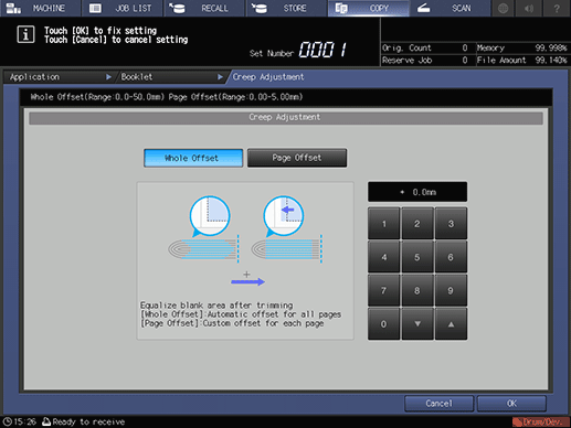 • supplementary explanationDisplay the Creep Adjustment screen, and then select Whole Offset or Page Offset. Then, use the keypad on the screen or press the down or up key to enter the offset amount. Press OK.
