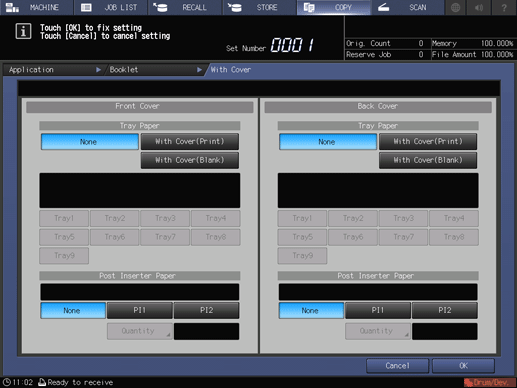 • supplementary explanationWhen there is an original to be copied on the back cover, select With Cover(Print) under Back Cover. When there is a blank original on the back cover, select With Cover (Blank) under Front Cover, then select the paper tray in which a cover sheet has been loaded in step 2. If there is no original page for the back cover, select None.