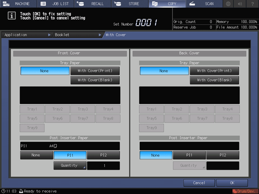 • preconditionWhen using cover paper different from paper for the body sets, load the same size as the body sets into another tray. Post inserter of Folding Unit FD-503 cannot be used for feeding covers and body sets.