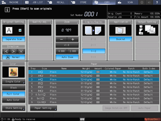 • preconditionSelect a body set from the Paper list on the COPY screen. The longer side of the selected paper is divided into two parts to be printed. The Automatic Image Rotation functions as needed. Also, Auto Zoom is automatically selected.