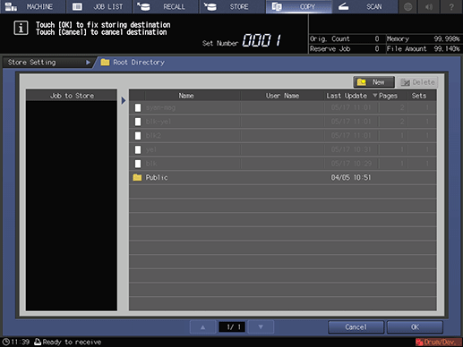 Select HDD Store + Print or HDD Store to display the Root Directory screen, then specify the location to save an HDD saved job.