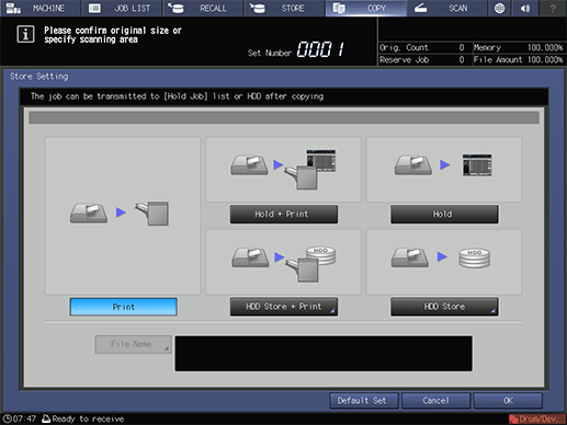 With Hold or HDD Store selected, a job is held or saved on the HDD without being copied.