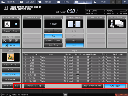 • supplementary explanationWhen HDD Store + Print, Hold + Print, or Print is selected, Ready to copy is displayed in the message display area of the COPY screen.