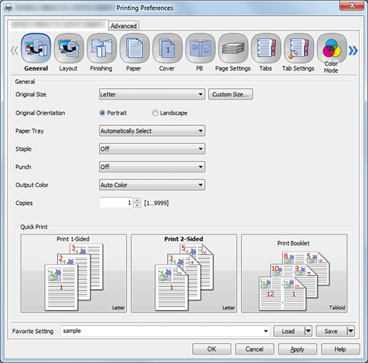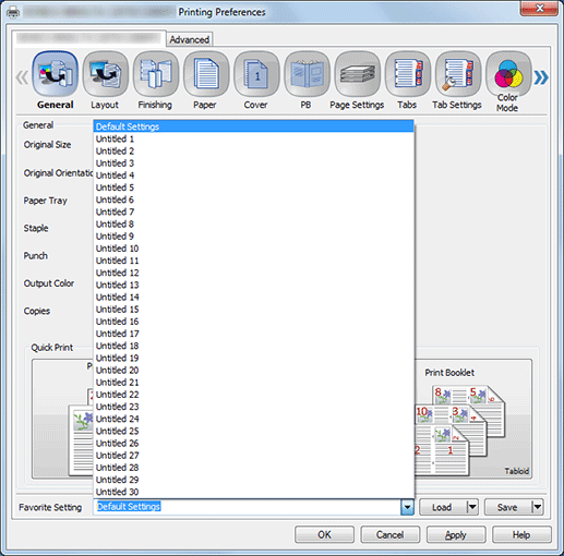 Favorite Setting and General are functions that are only available for the PS Plug-in driver. These functions are not available for other drivers.