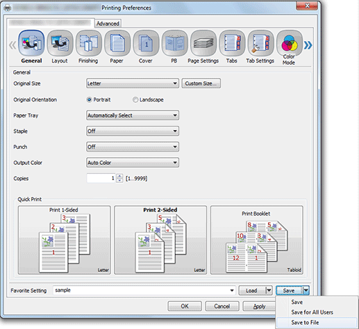 • supplementary explanationIf Save for All Users is selected in the Save pull-down menu, the current setting is saved in the favorite setting of all users when one computer is shared by multiple users. Only the user with administrator privilege can use.