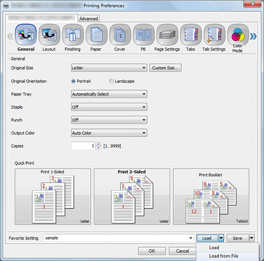 • supplementary explanationIf you select Load from File in the Load pull-down menu, you can open data (print setting file) written to the file and recall the desired setting.