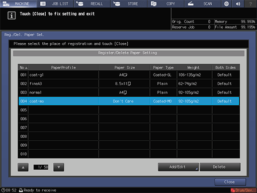 • supplementary explanationPaper profiles registered in the Change IndividualSet screen are also displayed in the Reg./Del. Paper Set. screen.