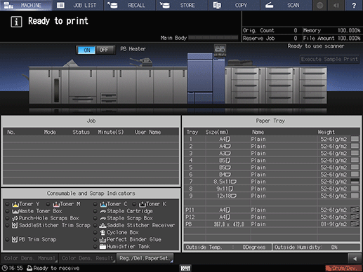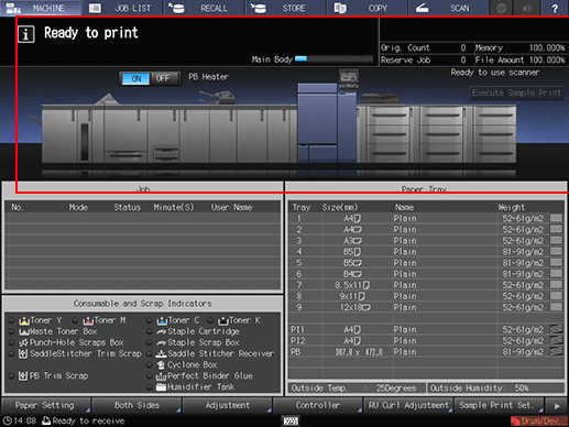 • supplementary explanationYou can set Paper Type / Profile Name / Paper Size / Weight / Colored Paper / Punch / Both Sides Adj. / RU Curl Adj. / Thickness / Color Density.