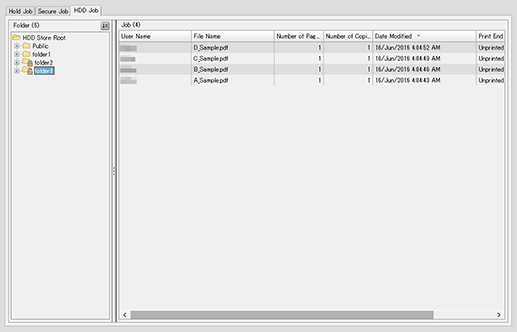 Print End Date | Displays the print end date of the HDD job. The jobs saved on the HDD are displayed as "Unprinted." The jobs which can be edited only with the touch panel of the main body are displayed blank. |