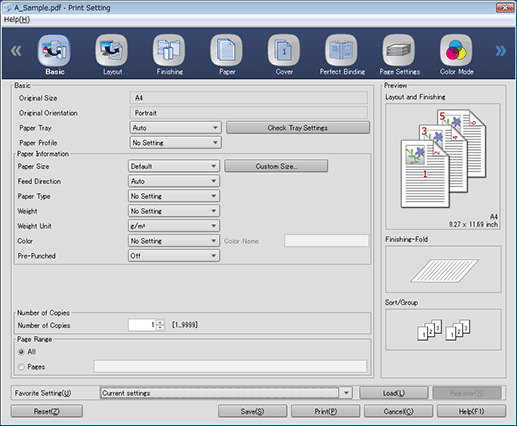 The items for print setting are divided into multiple setting screens. Selecting the tab (icon) in the upper part of the screen displays the corresponding setting screen at the bottom of the screen. The types of setting screens are as follows: