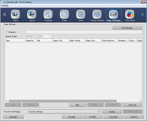 The setting items here are the same as those of "Page Settings" screen of the PS Plug-in driver except Tab Settings, Up, Down, Add, and Edit. For details about the description of the common setting items, refer to [Page Settings] Screen.