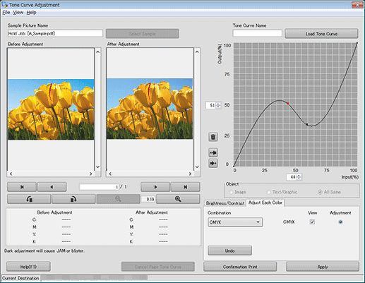 You can adjust the tone curve per job for the hold jobs. This is a convenient function when reprinting the job after adjusting the tone curve only. Also, you can adjust tone curves for each page (Page Tone Curve).