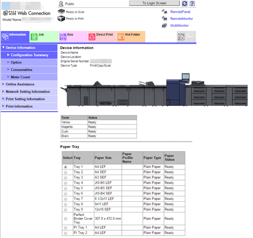 Web Connection is a device control utility program. This utility allows you to display the status of the printer, scanner, and network, perform the machine maintenance or to make the security, printer, scanner, and network settings via a Web browser.