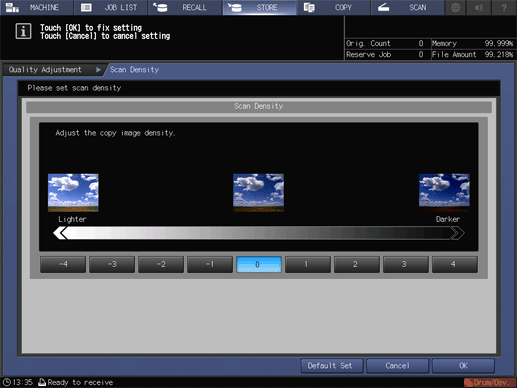 Adjust the scan density of the entire original, density of the original background, image outline, and contrast. Also, adjust the separation output level of the text part and photo part in an image.