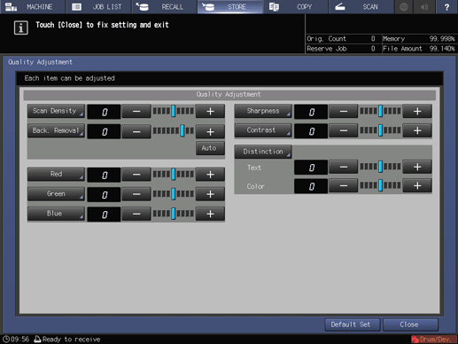 Default Set on the Quality Adjustment screen, all the quality adjustment settings are returned to their respective defaults.